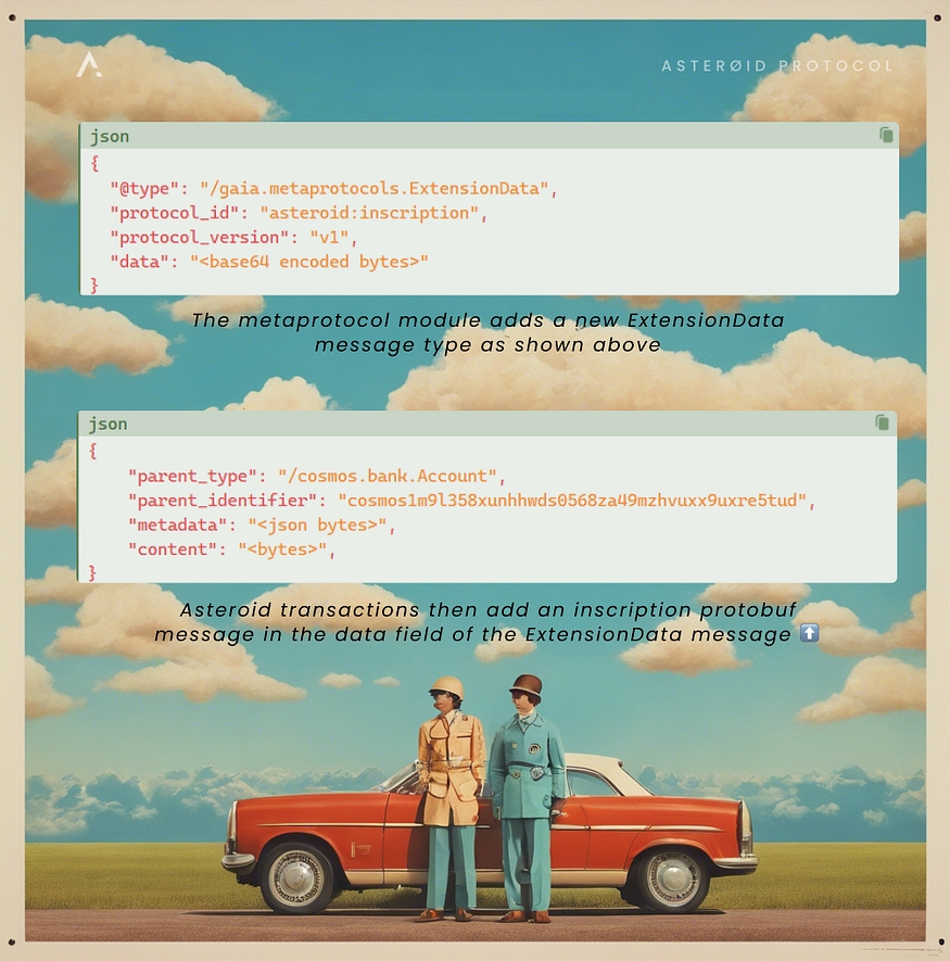 Asteroid transactions then add an inscription protobuf message in the data field of the ExtensionData message as follows: